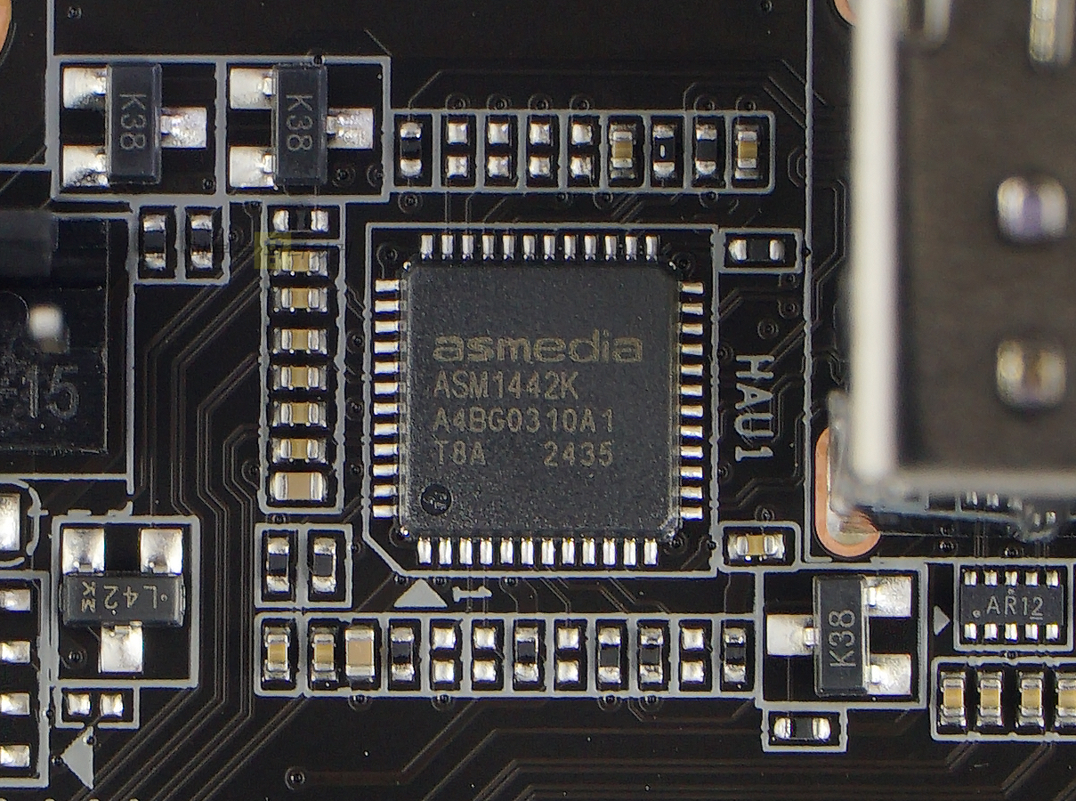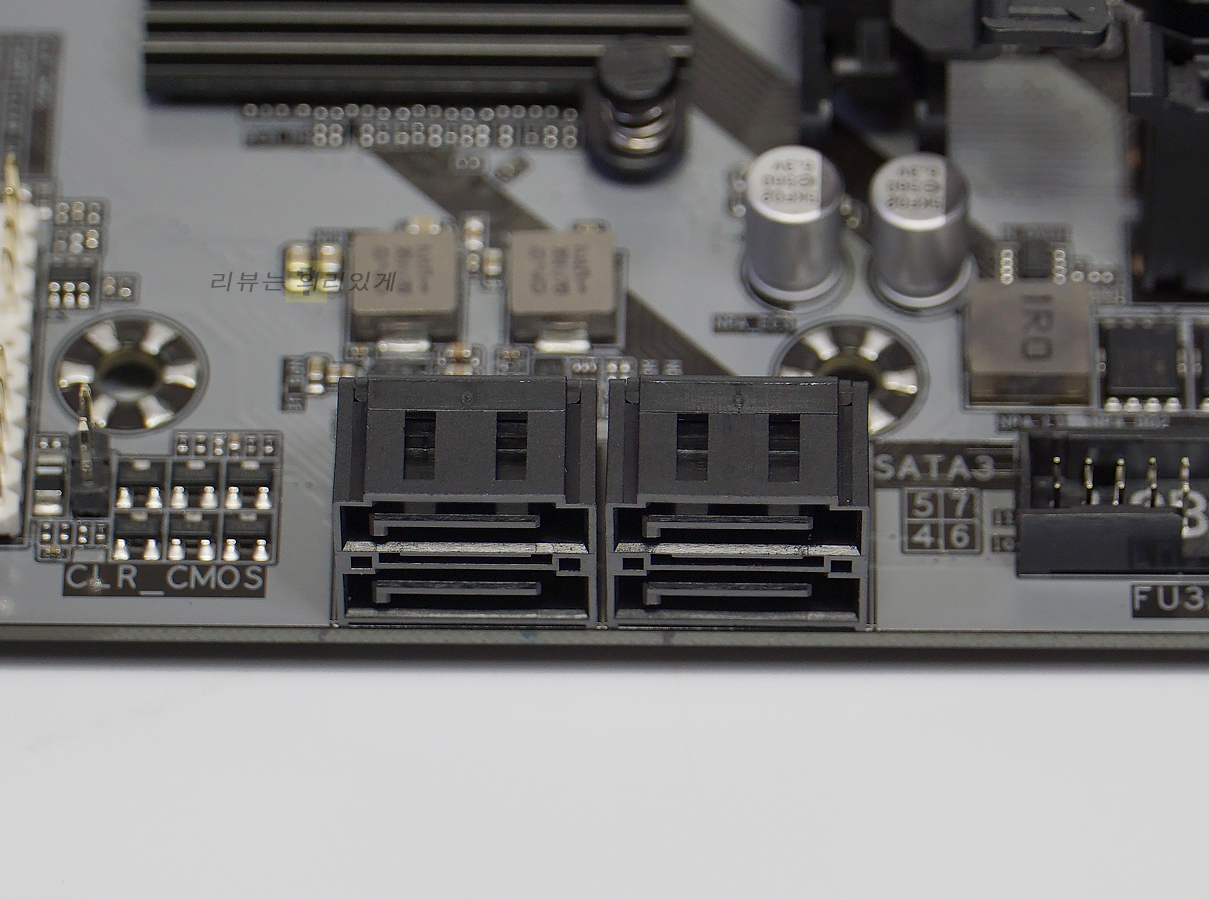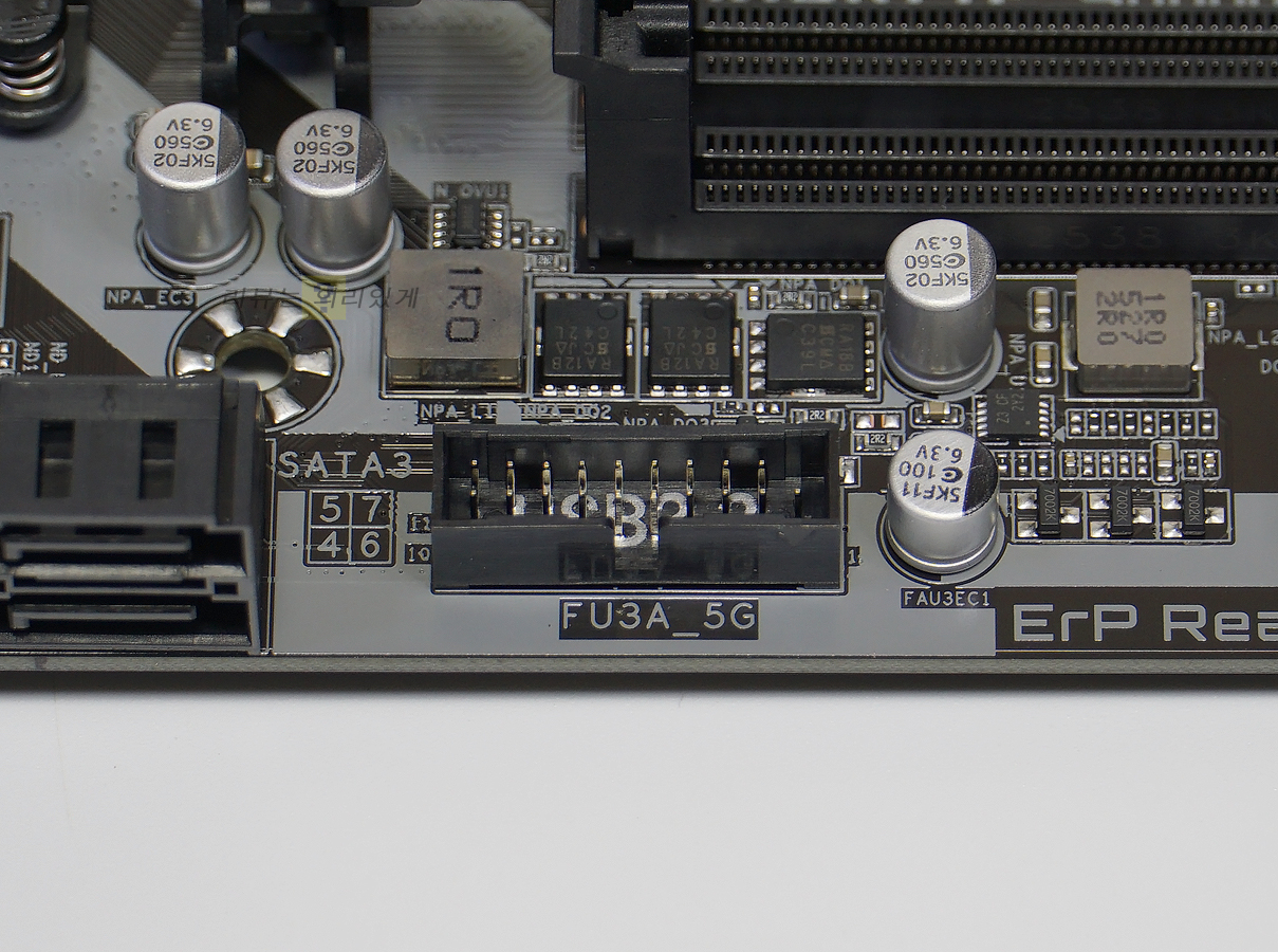SATA 포트는 4개 제공되며 수평 방식이 사용되었습니다. 확장 커넥터로는 우측 하단에 USB 3.2 Gen 1 (5Gbps) 헤더 1개와 하단에 위치한 일반적인 USB 2.0 헤더가 배치되어 있습니다. 이를 통해 전면 패널의 고속 USB 포트 및 추가 USB 포트를 활용할 수 있는데, 아쉽게도 썬더볼트와 같은 고속 충전 기술은 지원하지 않습니다.