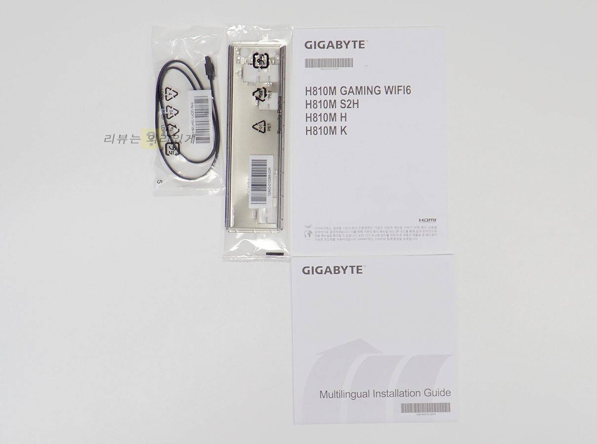 구성품으로 SATA 케이블, I/O 실드, H810M 시리즈 공용 안내문, 다국어 설치 가이드가 제공됩니다.