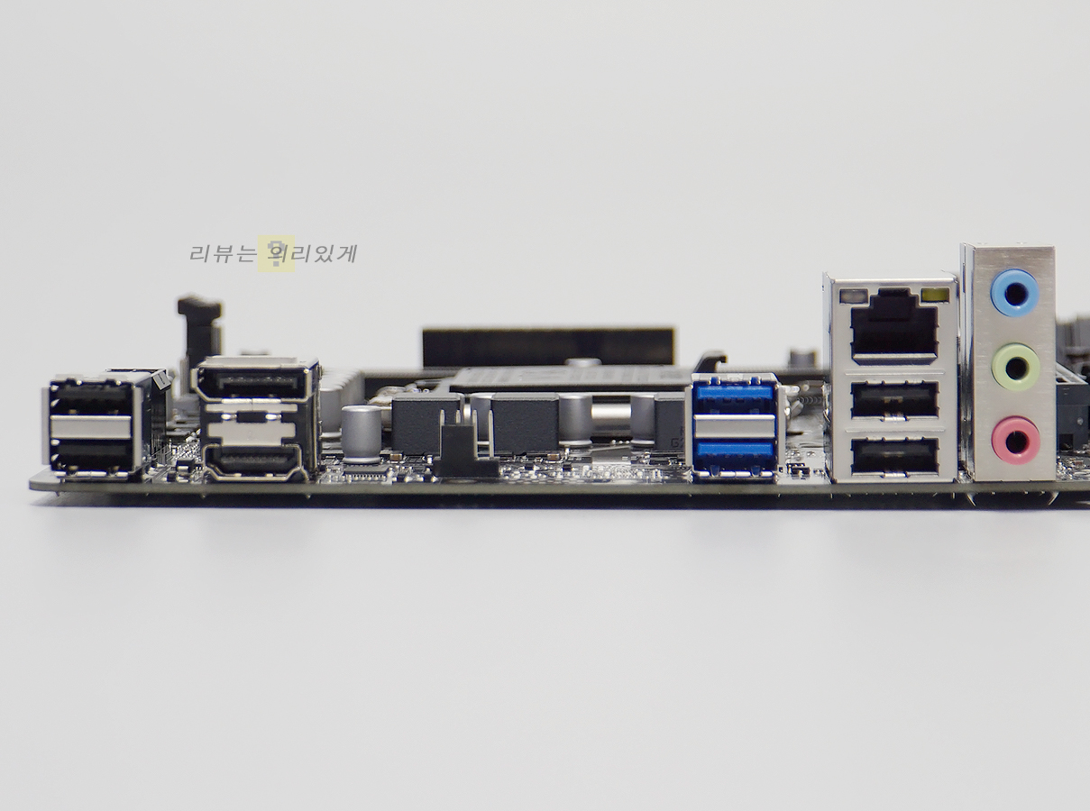 후면 단자에는 USB3.x 5Gbps, USB 2.0, RJ-45, 오디와 잭과 내장 그래픽 연결을 위한 HDMI 및 DP단자가 부착되어 있습니다. I/O 실드는 일체형이 아닌 이전 방식으로 제공되고 있으며 케이스 장착 시 먼저 부착한 다음 메인보드를 조립해야 합니다.
