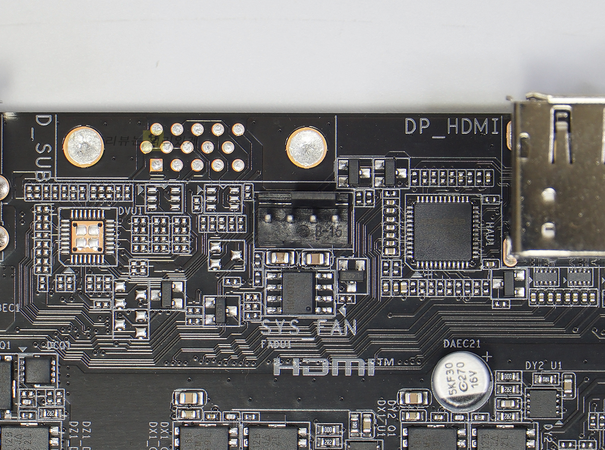 CPU FAN과 SYS FAN은 우측 상단과 좌측 중간에 위치해 있으며 아쉽게도 조명효과를 위한 ARGB 5V 3핀 헤더는 제공되지 않습니다. 이러한 이유로 인해 수랭 쿨러 장착을 고려하지 않았다고 볼 수 있는데, 장착 위치나 ARGB 헤더 미지원과 연장선이 없으면 장착조차 할 수 없는 SYS FAN 헤더 위치를 예로 들 수 있습니다.