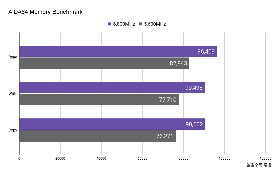 AIDA64 메모리 벤치마크에서는 읽기, 쓰기, 복사와 레이턴시를 측정하게 되는데 각 속도가 모두 크게 상승한 것을 알 수 있었습니다. 덕분에 대용량 파일을 다루거나 멀티태스킹, 최신 고사양 게임에서 데이터를 더 빠르게 불러올 수 있게 됩니다.