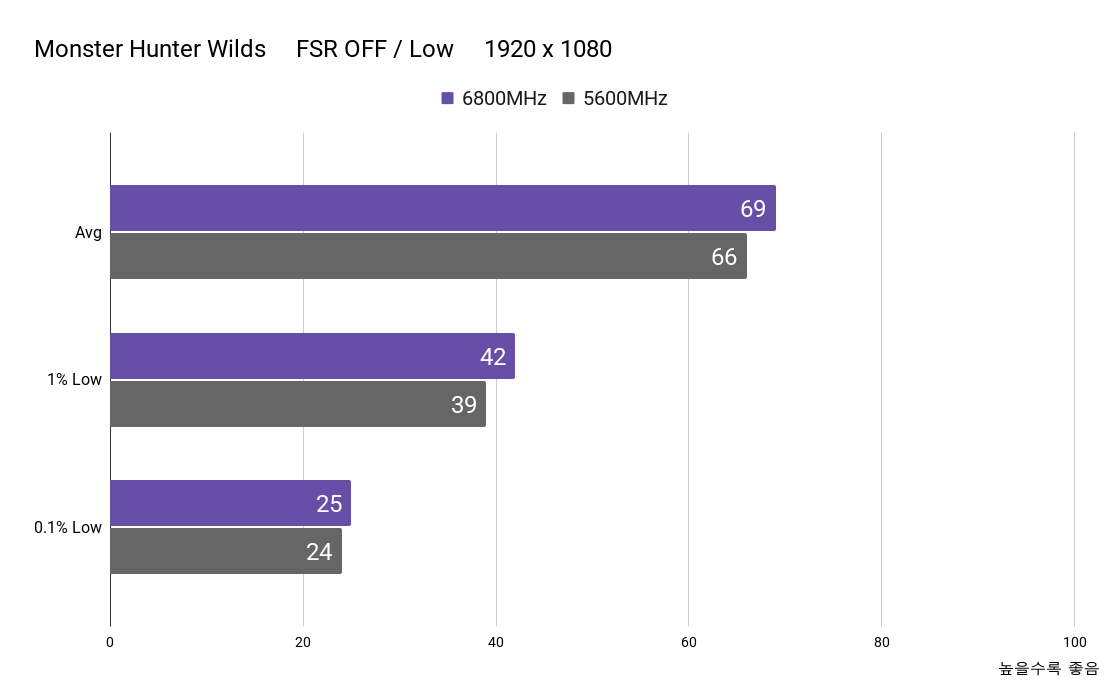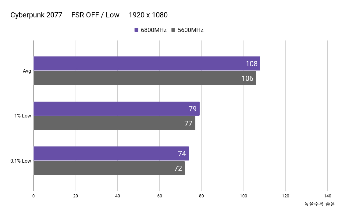상승 폭이 크지는 않았으나 단순히 평균 프레임만 오르는 것이 아니라, 1%와 0.1% Low 지표가 고르게 상승했습니다. 하이엔드 그래픽카드를 사용한다면 프레임 향상은 더 클 것이라 생각됩니다.