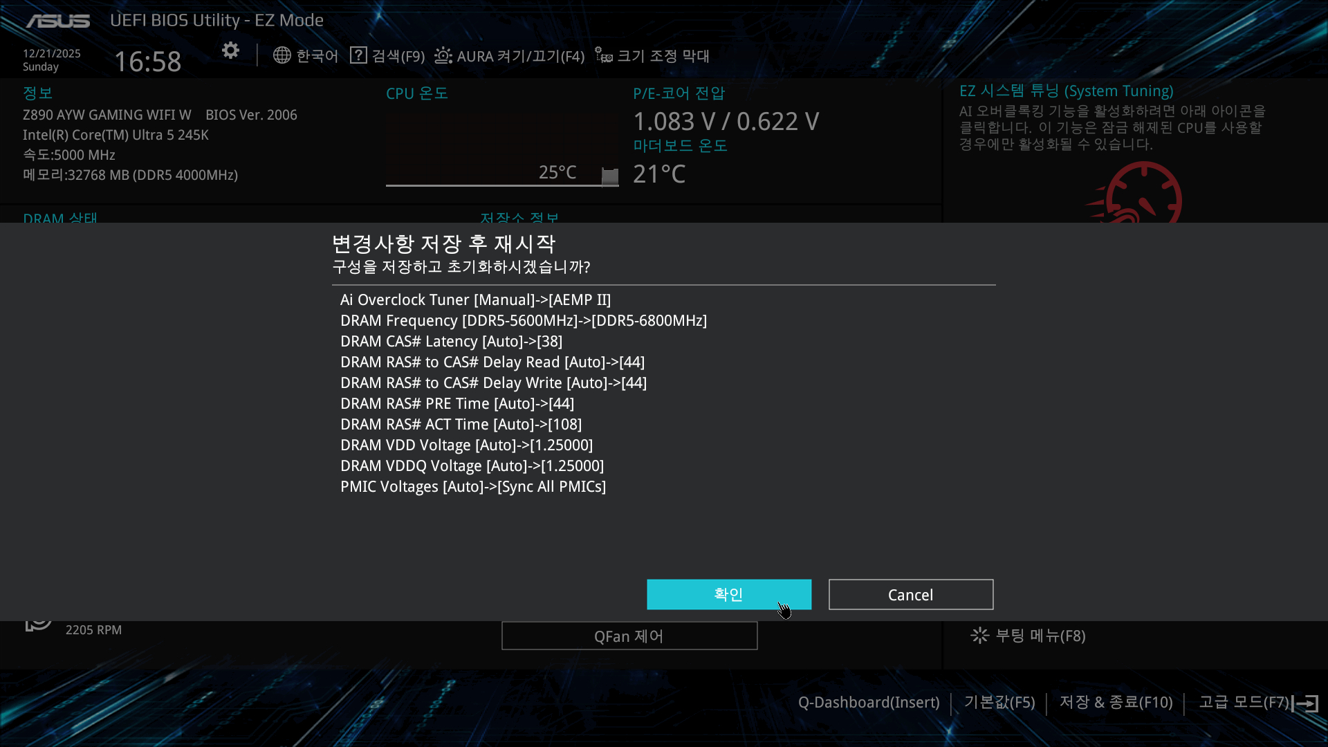 본 리뷰에서는 ASUS 메인보드의 자동 RAM 오버클럭 기술(ASUS Enhanced Memory Profile 2) 일명 AEMP II를 활용해 메모리 오버클럭을 진행하였습니다. 이에 따라 5600MHz 메모리는 6800MHz까지 상승하였으며 램 타이밍은 CL38, 전압은 1.25V로 변경되었습니다. 이는 ASUS Z890 보드의 AEMP II와 SK하이닉스 A-Die 칩을 통한 오버클럭 잠재력 덕분으로 보입니다.