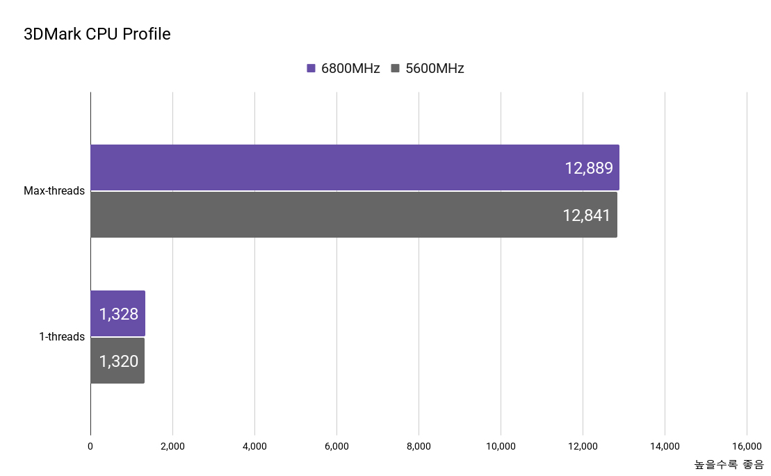 3DMark의 경우 파이어 스트라이크와 CPU 프로파일의 경우 점수 차이가 크지 않았습니다. 이는 파이어 스트라이크가 DirectX 11 기반인 것과 DX12에 비해 CPU의 멀티 코어 활용 능력이 떨어지고 메모리 대역폭보다는 CPU의 순수 클럭 속도에 더 의존하기 때문으로 보입니다. 또한 CPU Profile에서도 CPU 코어 자체의 순수 연산 성능인 클럭과 아키텍처를 측정하기 때문에 메모리 오버클럭으로 인한 차이가 크지 않았습니다.