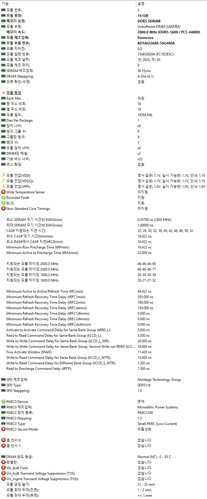 CPU-Z와 HWiNFO에서 확인한 바와 같이 PMIC 저전력 설계가 적용되어 1.1V 저전압으로 구동되고 있습니다. 또한 가장 중요한 SK하이닉스 A-Die라는 것을 알 수 있습니다. 또한 온도 센서도 포함되어 있어 메모리 온도 확인도 가능합니다.