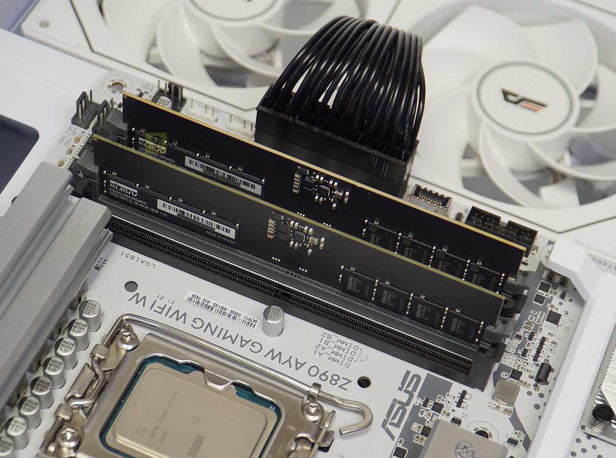 ESSENCORE KLEVV DDR5-5600 CL46 파인인포는 DDR5 메모리 규격으로 DDR4 메모리를 지원하는 메인보드에서는 사용할 수 없습니다. 본 리뷰에서는 화이트 색상 메인보드를 사용해 서로 색상이 대비되고 있지만 검은색 또는 어두운색 메인보드를 사용하면 적절한 분위기를 연출할 수 있을 것입니다.
