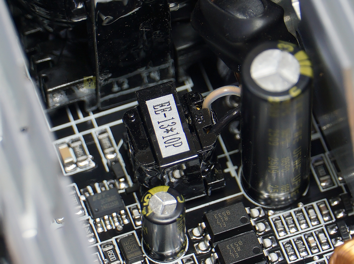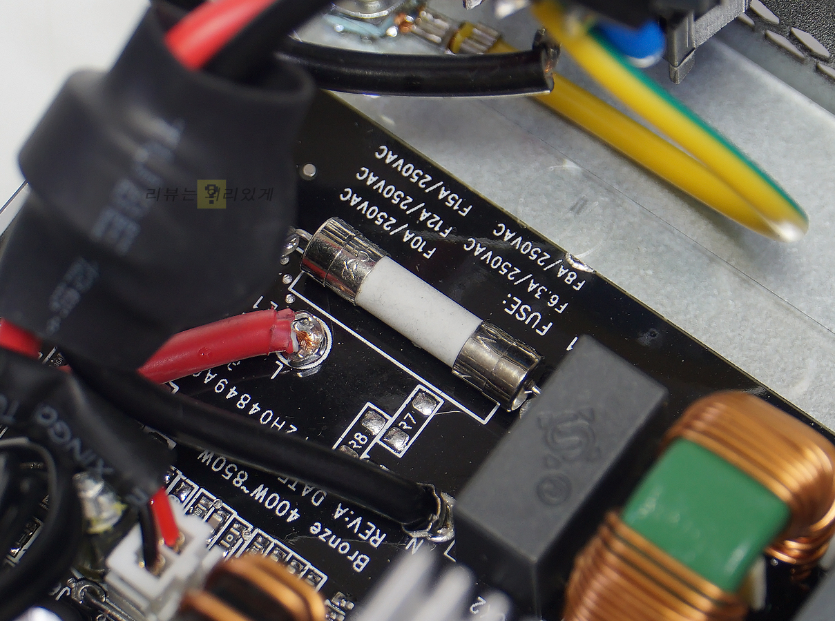 메인 커패시터는 Toshin Kogyo LFX 420V / 330uF / 105℃가 1개 사용되었으며 2차 커패시터는 Nichicon UFWE 105℃ 시리즈가 사용된 것으로 보입니다. 메인 트랜스와 스위칭 트랜스 구성을 확인할 수 있었으며 EMI 필터와 하단에 부착된 접지와 퓨즈를 확인할 수 있습니다.