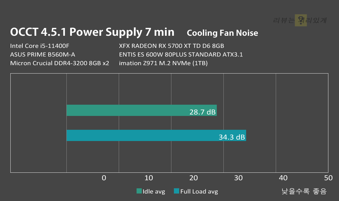 쿨링팬의 경우 유휴 상태에서는 28.7 데시벨로 조용한 편이었으며 풀로드 상태에서는 34.3 데시벨로 그렇게 높은 편은 아니었습니다. 컴퓨터 사용 시 CPU 쿨러와 그래픽카드 및 PC 케이스 쿨링팬과 다른 요소가 포함되어 있기 때문에 이를 감안하면 대체로 조용한 사용이 가능해 보입니다. 이는 120mm HDB 쿨링팬을 탑재하였기 때문으로 보입니다.