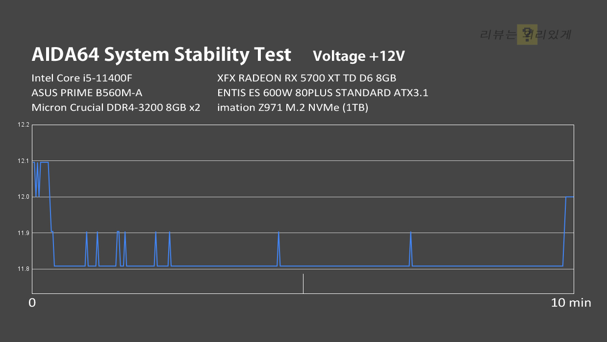 +12V 전압의 경우 전압이 기준치(12V)보다 약간 낮게 유지되는 구간(11.8V)이 보이고 있으나 오차 범위 내에서 안정적으로 들어와 있습니다. 테스트 중 전압 변동 폭이 크지 않고 일정하게 유지되는 것으로 보아, RX 5700 XT와 같은 전력 소모가 큰 그래픽카드도 충분히 안정적으로 뒷받침하고 있습니다.