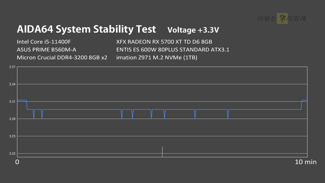 +3.3V 전압은 약 3.28V ~ 3.31V 사이로 매우 안정적이며 세 전압 라인 중 변동 폭이 가장 적으며, 기준치(3.3V)에 가장 근접하고 있습니다.