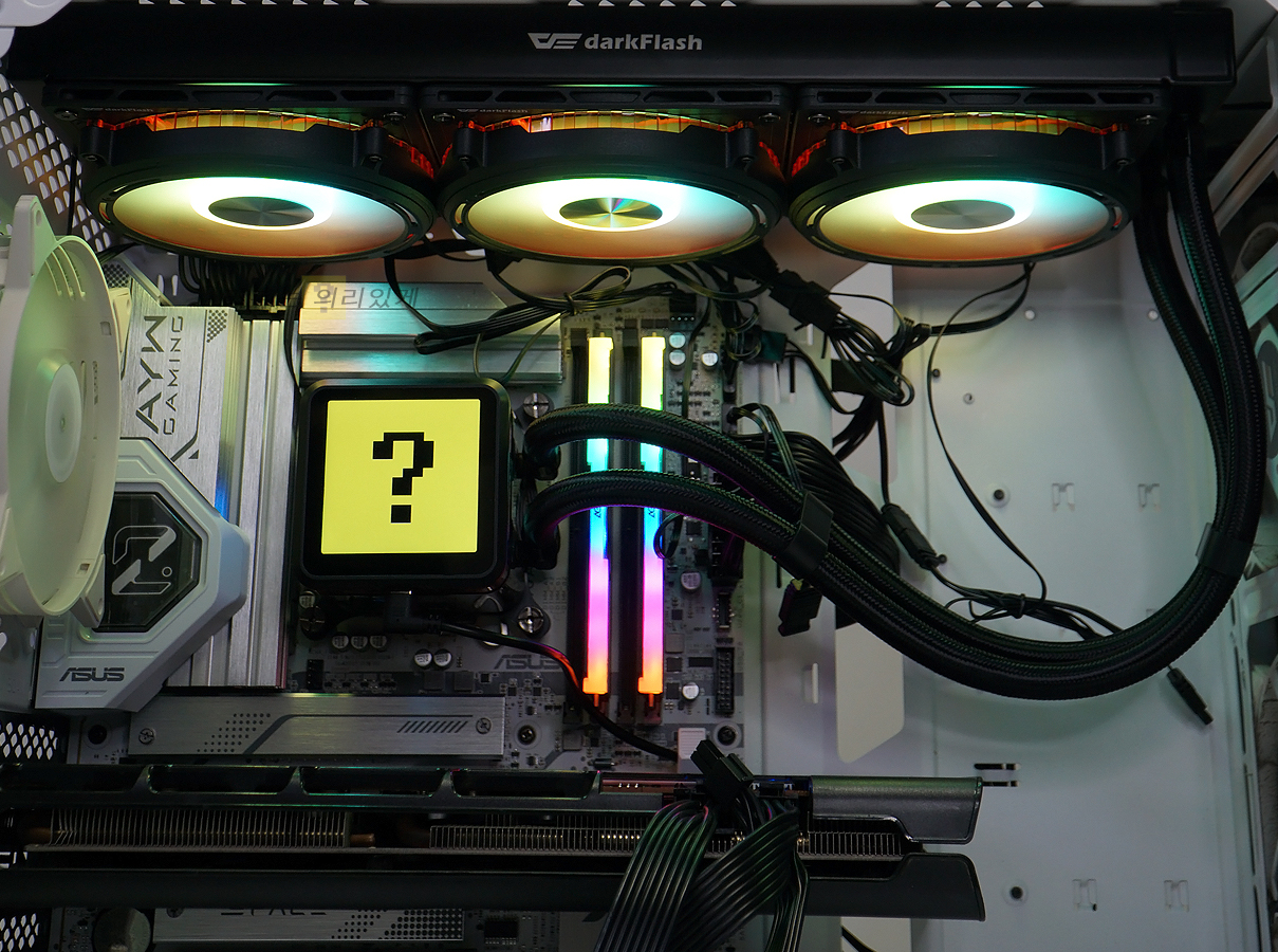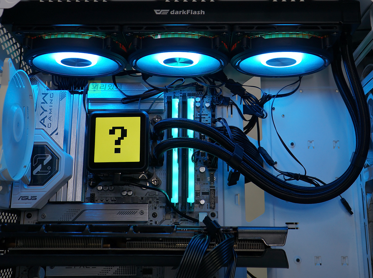 이미지에서 확인하였듯이 쿨링팬 3개와 펌프 유닛에 부착된 여러 커넥터가 많이 보이는 데 이것을 가능한 보이지 않도록 수납하고 정리할 수 있게 하여야 하는데 무방비로 그대로 드러나게 하고 있어 선정리가 어렵다는 아쉬움이 있습니다.