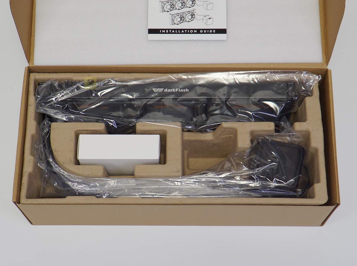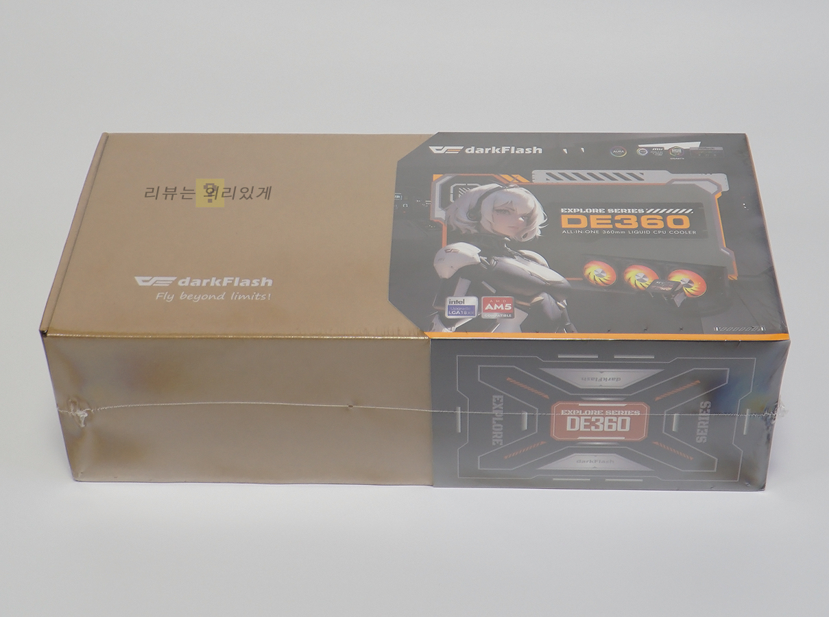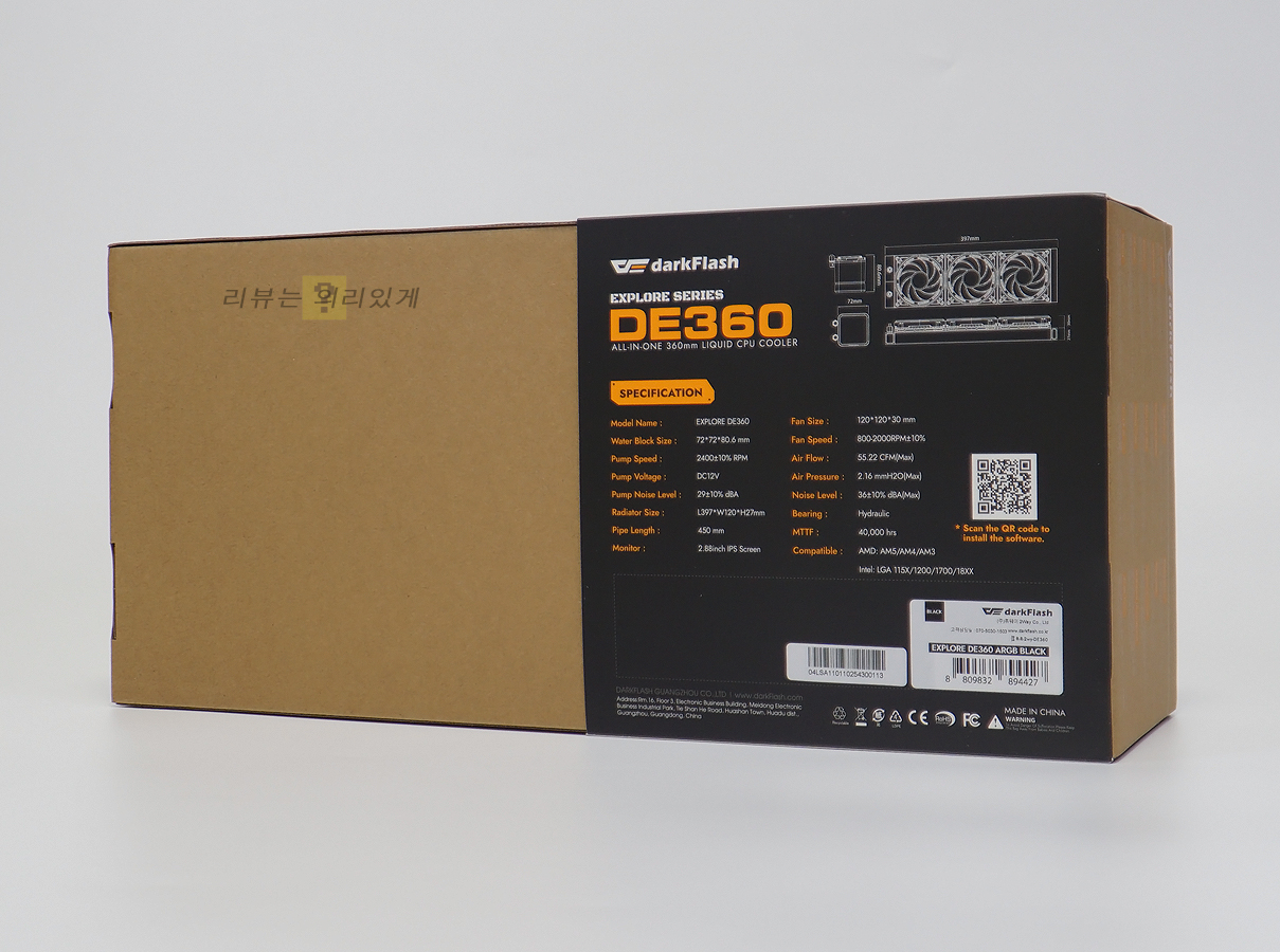 darkFlash EXPLORE DE360 ARGB는 블랙, 화이트 두 가지 색상으로 출시되었으며 리뷰에 사용된 제품은 블랙 색상입니다. 120mm 팬 3개를 사용한 360mm 3열 수랭 쿨러이며 튜브에는 클립 2개를 부착하여 선정리를 편하게 하였습니다. A/S 보증 기간은 5년 무상보증 및 3억 원 생산물 책임보험 가입되어 있으며 쿨링팬은 3년 무상 보증을 제공합니다.