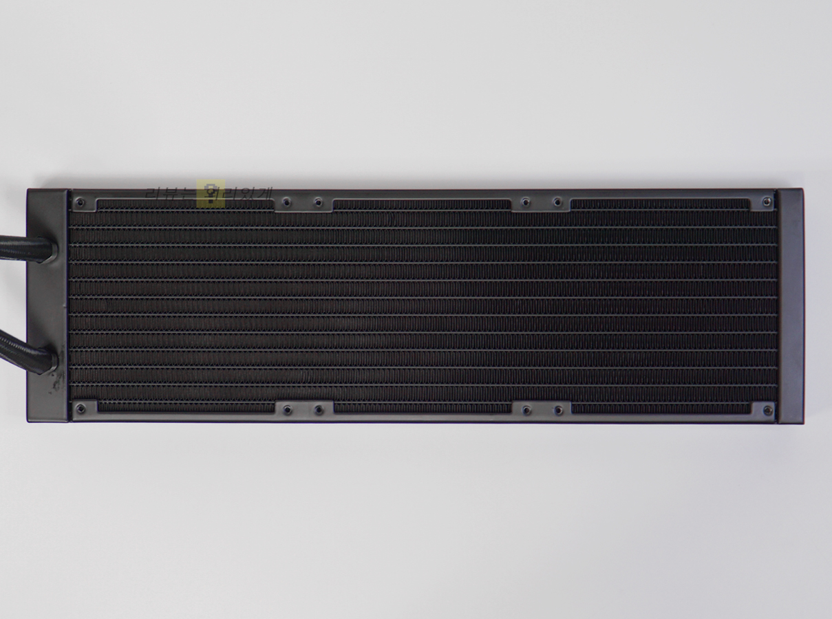 라디에이터는 360mm로 흔히 알고 있는 수랭 쿨러에서 사용되는 형태에서 크게 벗어나지 않았습니다. 튜브에는 내구성 강화을 위한 커버를 추가하였으며 쿨링팬은 나사로 결합되어 있습니다.