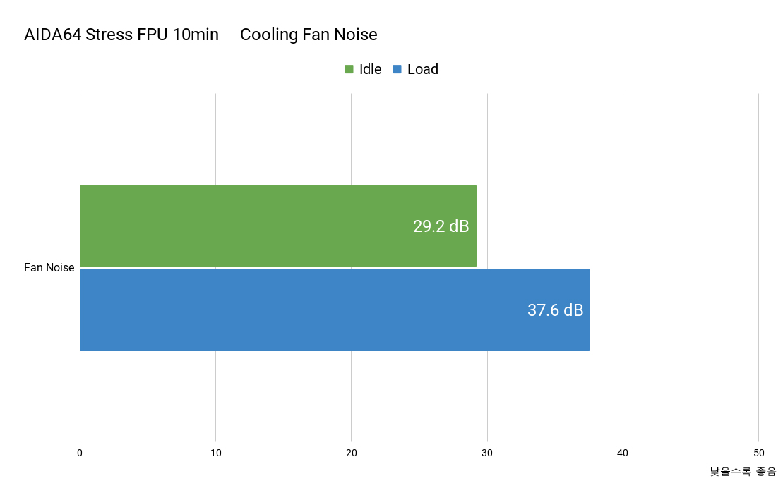 유휴에서는 평균 29.0 데시벨로 측정되었는데 3팬을 사용하는 수랭 쿨러라는 것을 생각할 때 어느 정도 조용한 편에 속합니다. 풀로드의 경우 평균 37.6 데시벨로 작동하였는데 쿨링팬이 최대 RPM으로 작동하지는 않기 때문으로 보입니다. 이를 감안하더라도 풀로드 상황에서도 소음이 들리기는 하나 거스릴 정도까지는 아니라 할 수 있습니다.