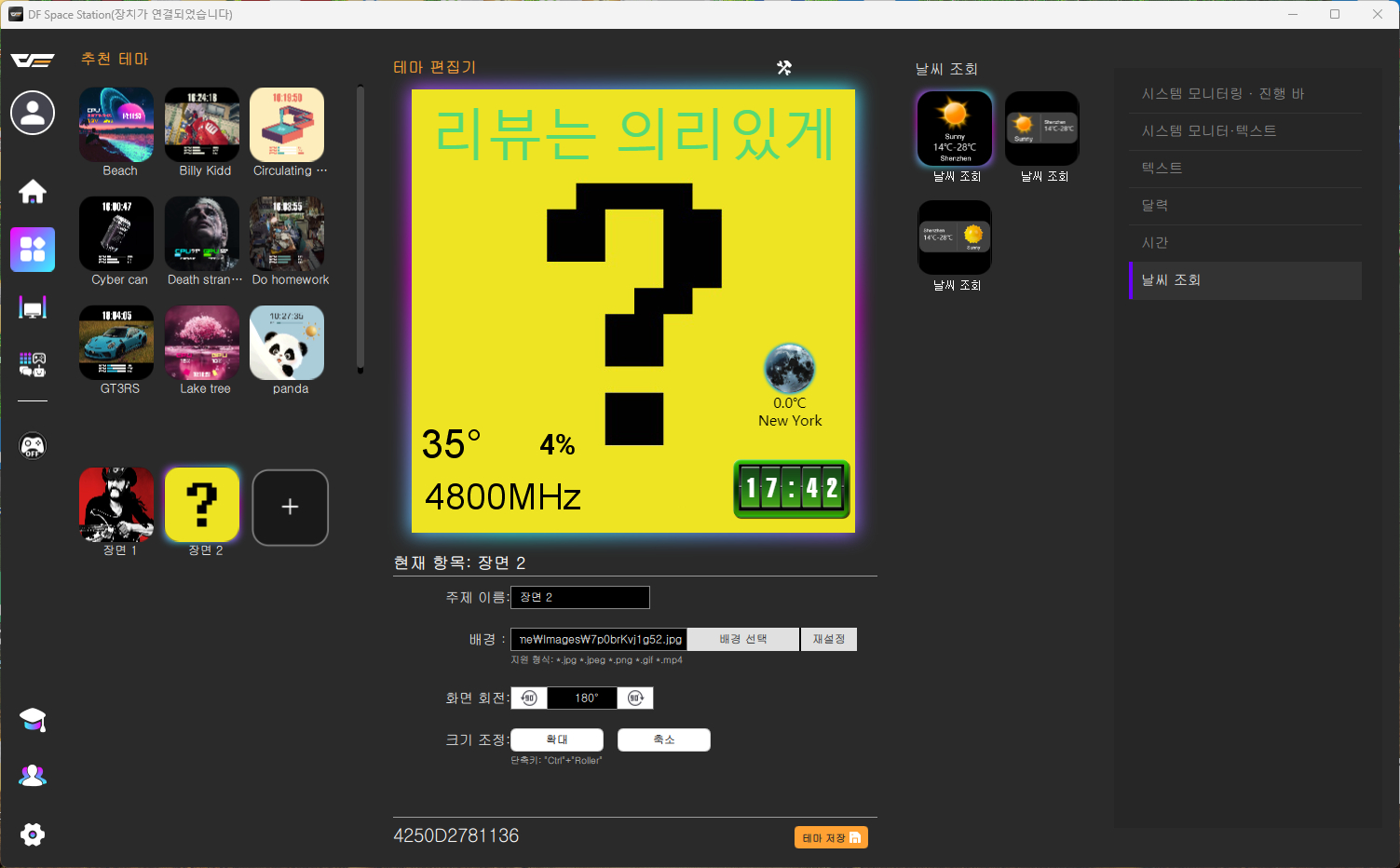 좌측 메인 메뉴와 우측 세부 메뉴로 분류되며 추천 테마를 그대로 사용하거나 사용자가 테마를 추가해 원하는 파일을 업로드한 뒤 시스템 모니터, 텍스트, 달력, 시간, 날씨와 같은 다양한 정보를 임의로 추가할 수 있습니다. 테마 편집기에서는 추가하고자 하는 텍스트와 글꼴과 색상 불투명도 등 다양한 옵션을 설정할 수 있습니다.