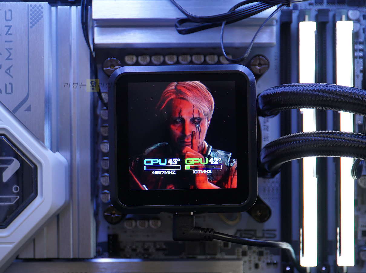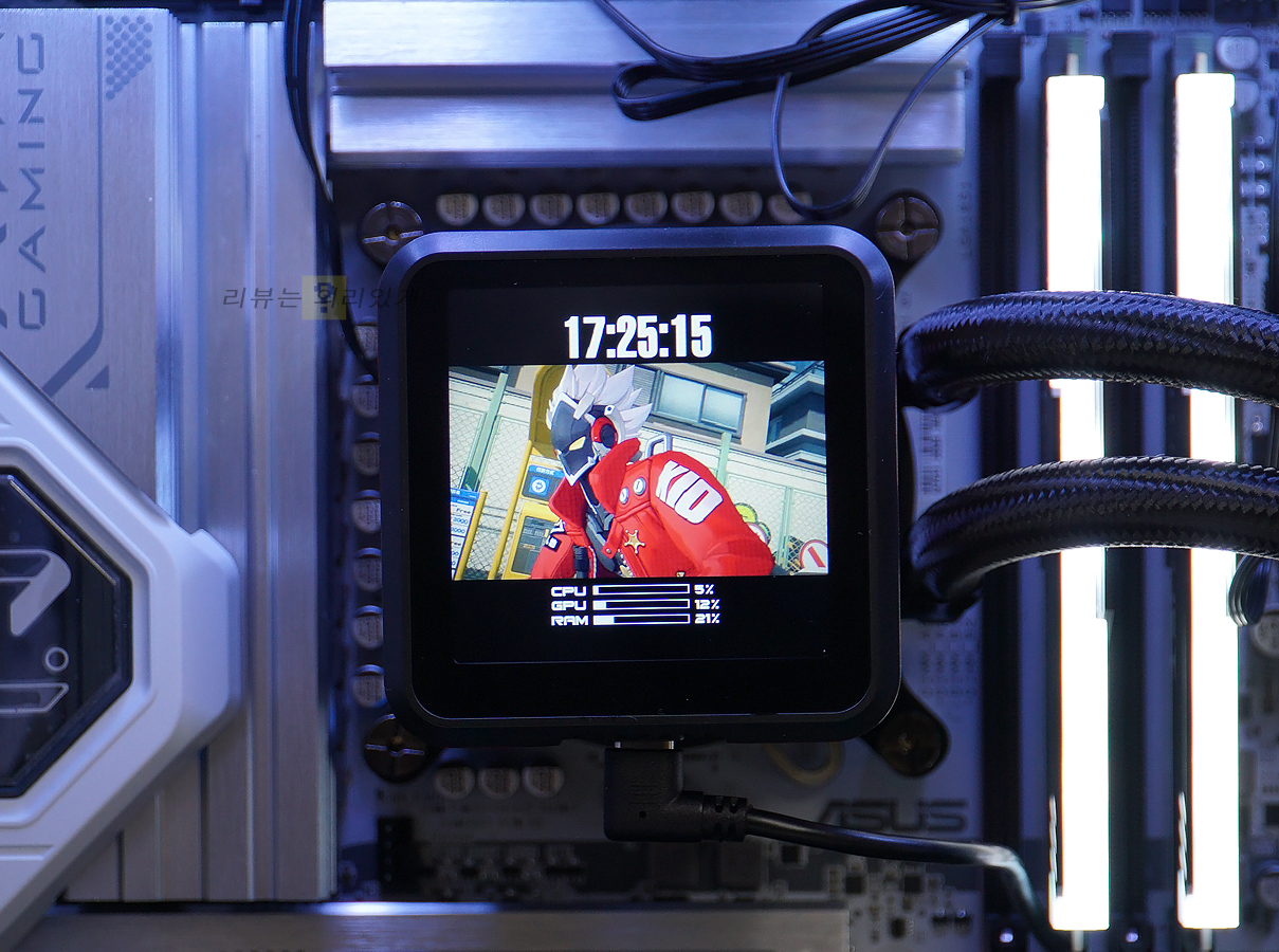 여기에 추가적으로 CPU/GPU 온도, 클럭과 같은 모니터링 정보와 날씨, 온도, 시간, 텍스트 등 다양한 요소를 추가할 수 있게 하였습니다. 디스플레이는 펌프 유닛에 자석 방식으로 고정되어 있어 사용자가 손쉽게 탈착과 부착이 간편하지만 다르게 보면 실수로 펌프 유닛을 들었을 때 디스플레이를 잡고 들게 되면 펌프 유닛은 바닥으로 떨어져서 파손될 가능성이 있다는 의미도 됩니다. 펌프 유닛 디스플레이는 튜닝을 위한 중요한 요소지만 작은 자석으로 붙어 있는 만큼 사용에 주의가 필요하기도 합니다.