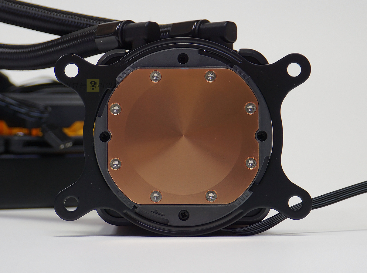펌프 유닛은 사각형으로 모서리를 둥글게 마감하였습니다. 추가로 투명 플라스틱을 사용해 내부가 반투명하게 보이게 하였으며 컴퓨텍스에서 함께 공개된 공랭 쿨러처럼 오렌지색 투명 플라스틱에 문구 등을 추가하여 SF 게임에서 사용되는 구조물 같은 느낌을 주고 있습니다.