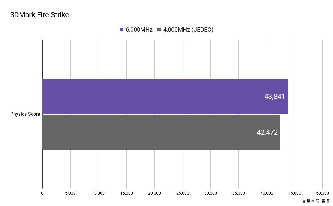 반면 구형 API 기반인 DX11 테스트인 파이어 스트라이크는 CPU의 물리 연산(Physics) 위주로 측정하는데, 메모리 성능보다는 CPU 순수 코어 클럭과 스레드 처리 능력에 더 의존하고 있기 때문에 점수 상승 폭이 크지 않았습니다.