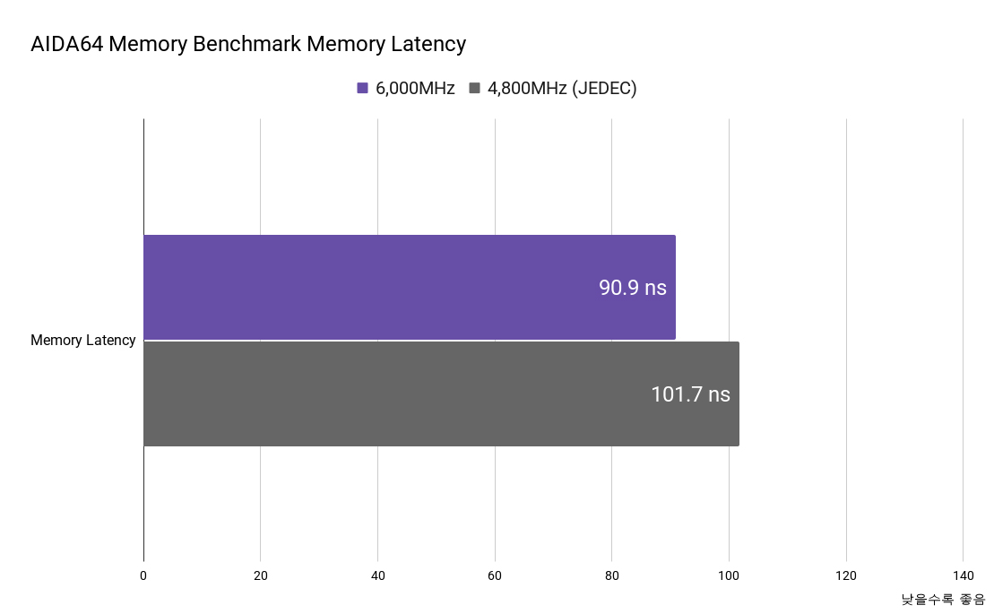 AIDA64 메모리 벤치마크에서는 읽기, 쓰기, 복사와 레이턴시를 측정하게 됩니다. 여기에서는 3가지 모두 확연히 차이가 느껴질 정도로 높은 성능 향상을 보이고 있었습니다. 레이턴시의 경우에도 100ns가 넘던 지연 시간이 90.9ns로 줄어들게 되었는데, 이는 CL30이라는 낮은 타이밍 값을 통해 지연 시간까지 실질적으로 단축시키고 있기 때문입니다.