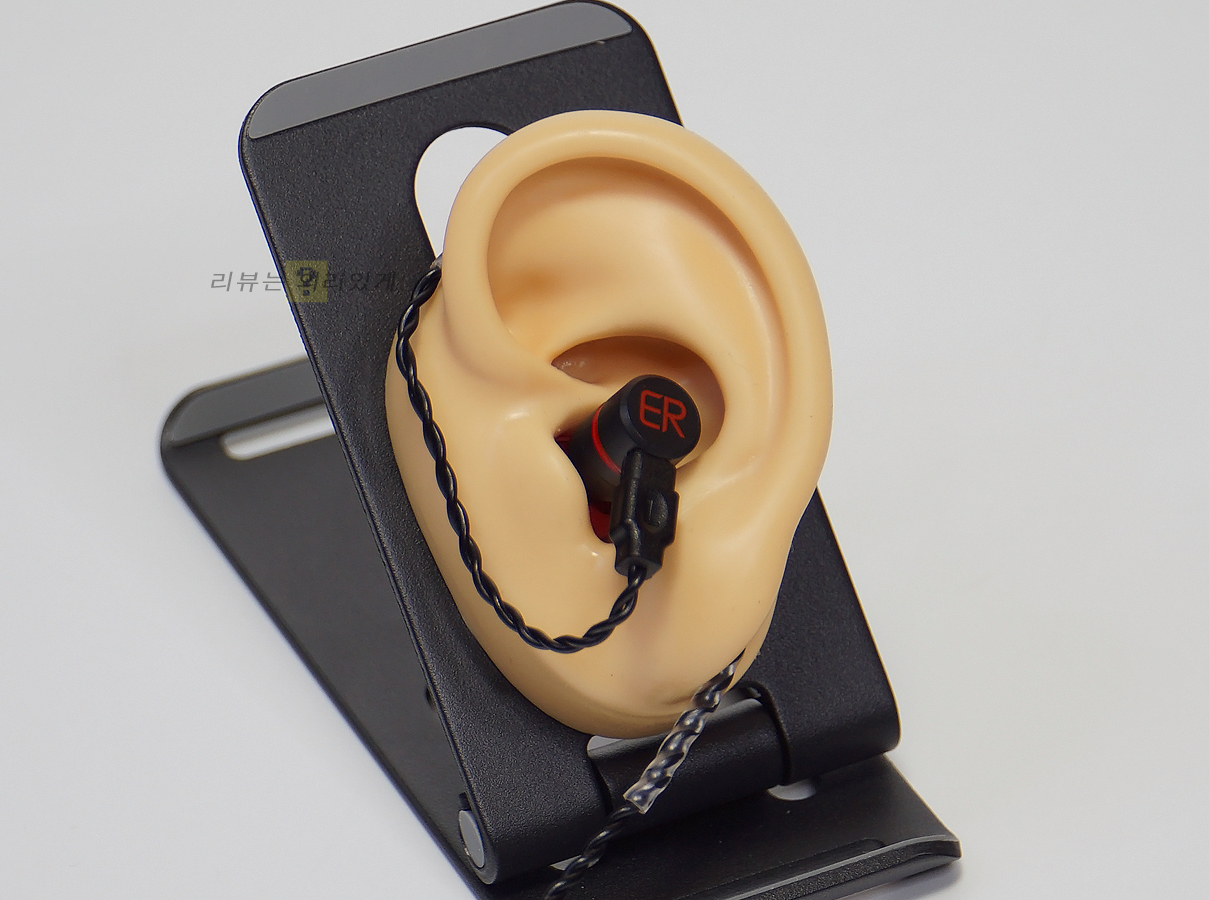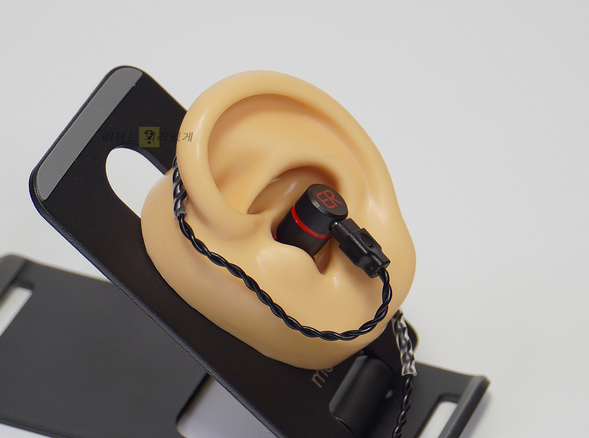 좀 더 안정적인 촬영을 위해 실리콘 모형 귀를 활용하였습니다. 대부분 이어폰에서 흔히 볼 수 있는 이어팁을 귀안에 집어넣는 인이어 방식을 사용하였습니다. 여기에 케이블을 귀 뒤로 넘겨서 착용하는 오버이어핏 방식을 사용하였는데, 귀에 닿는 케이블 끝부분에는 투명한 이어 가이드가 추가되어 별도의 고정 장치 없이도 귀 모양에 맞춰 안정적으로 밀착되고 있습니다.