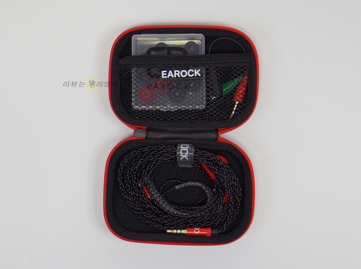 파우치는 하드 쉘 구조로서 내부 구성품의 손상을 막기 위해 단단한 재질로 구성되어 있습니다. 이어폰과 다른 구성품을 수납하기 위해 메쉬 포켓이 추가되었으며 다른 구성품을 추가해도 좋을 정도로 약간의 여유 공간이 보입니다.