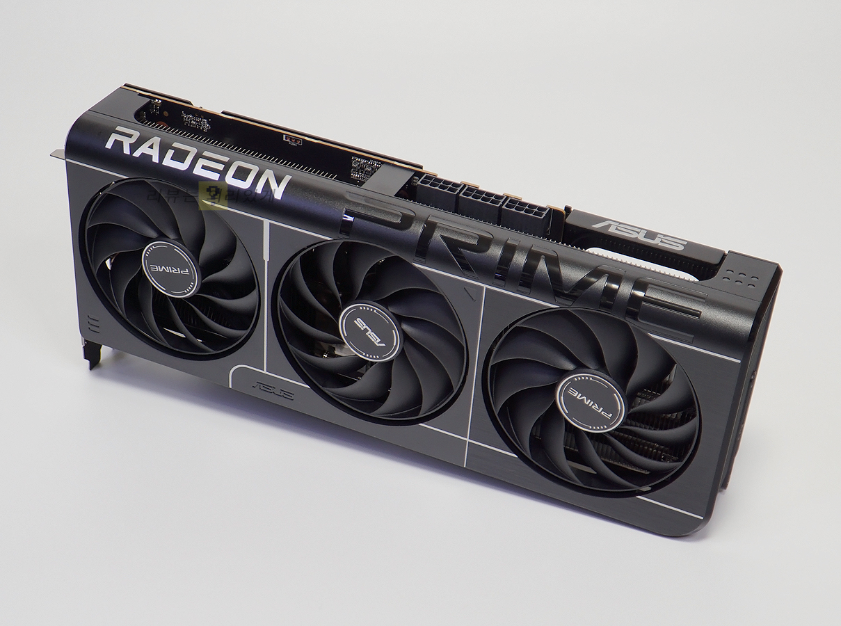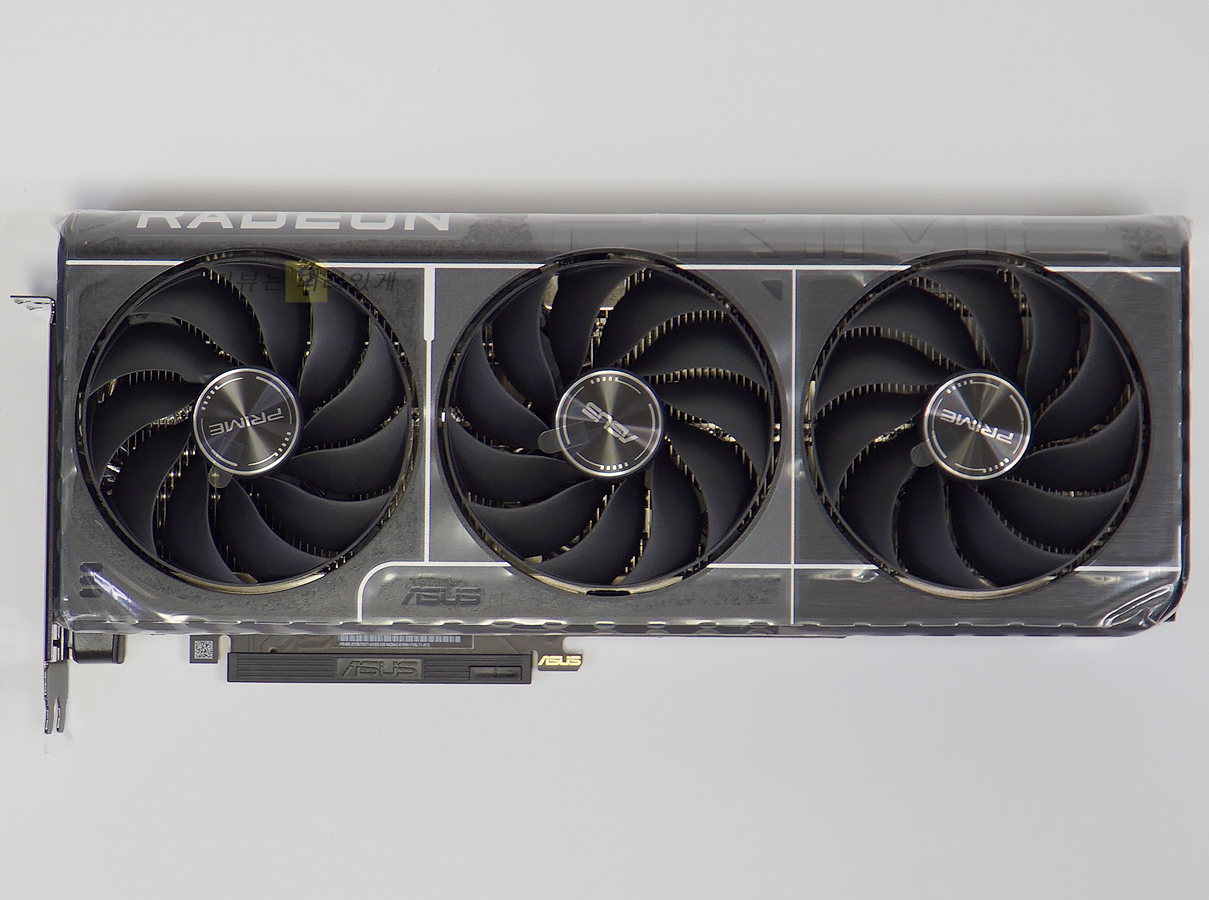 측면의 라데온과 PRIME 로고를 크게 각인하여 제품의 정체성을 강조하고 있습니다. RPIME 로고를 제외하면 무광 처리를 하였으며 자사의 TUF 제품군과 달리 곡선을 강조한 듯한 디자인을 확인할 수 있습니다. 전면에는 화이트 라인 포인트가 추가되었는데 이를 따라가면 작은 에이수스 로고를 확인할 수 있습니다. 세 개의 엑시얼 테크(Axial-tech) 팬이 탑재되어 냉각 효율을 높이고 있습니다.
