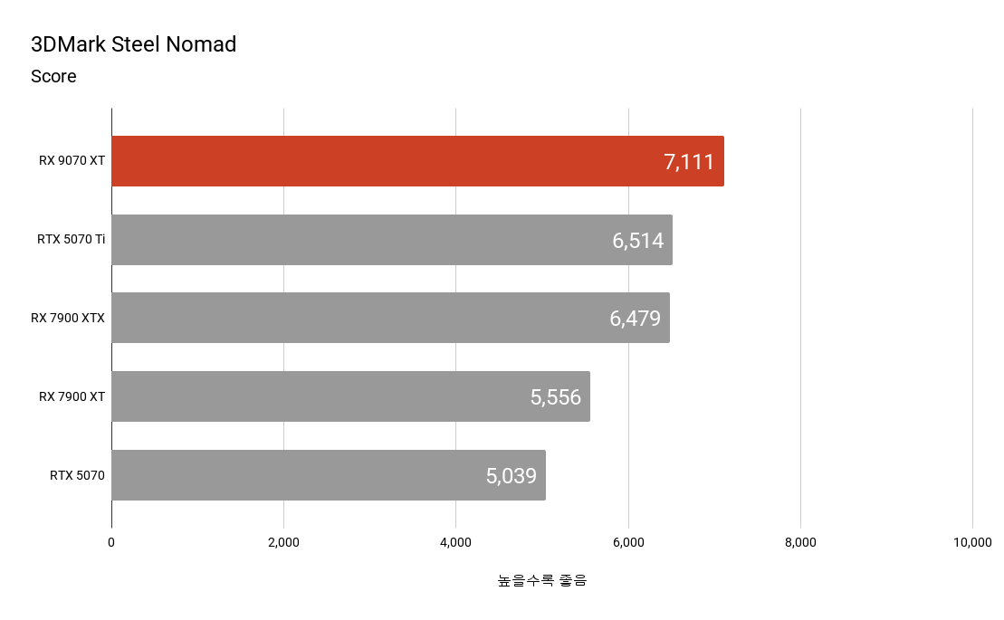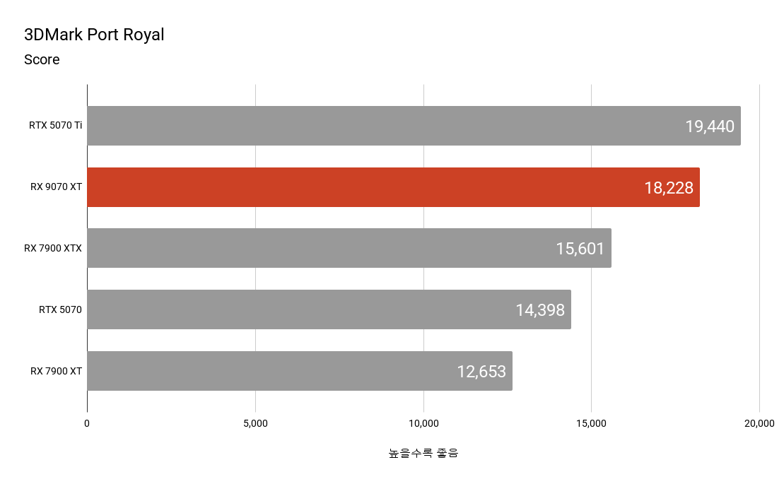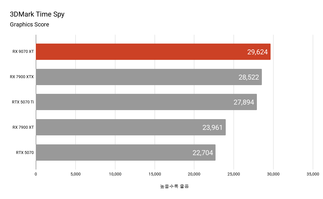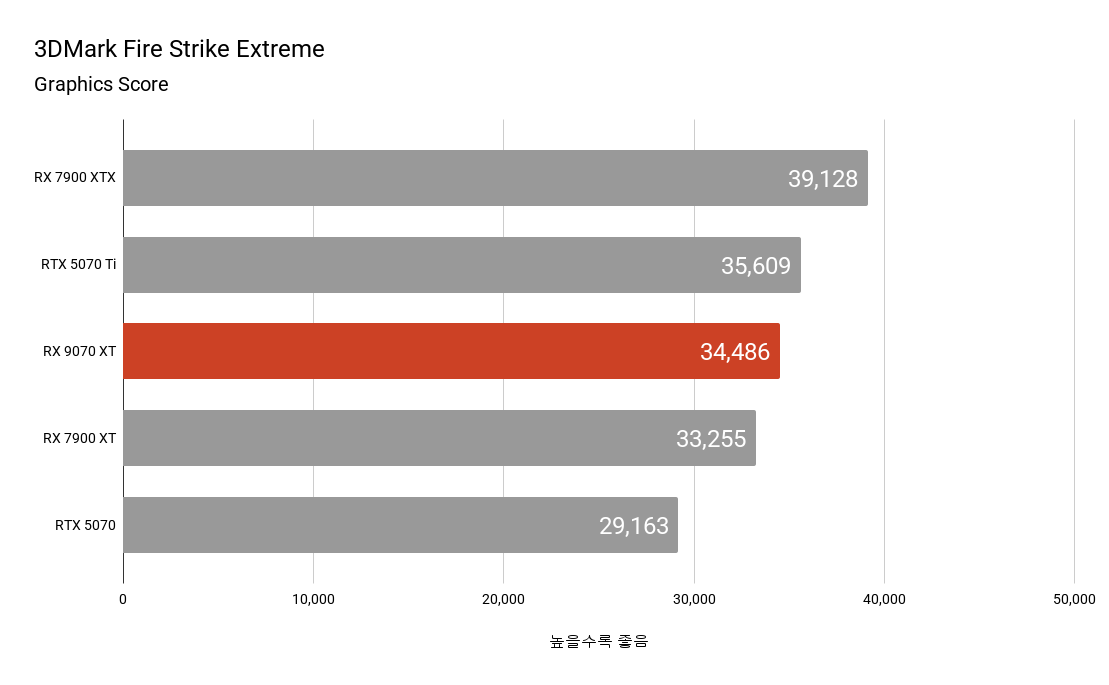 3DMark 벤치마크에서 전 세대 플래그십 모델인 라데온 RX 7900 XTX나 경쟁사 엔비디아 지포스 RTX 5070 Ti와 대등하거나 일부 결과에서는 이를 넘어서는 모습을 보여주기도 합니다. 파이어 스트라이크와 파이어 스트라이크 익스트림의 경우 DirectX 11 기반으로 하고 있어 최신 아키텍처인 RX 9070 XT가 RX 7900 XTX에 비해 낮은 점수를 기록하고 있습니다.