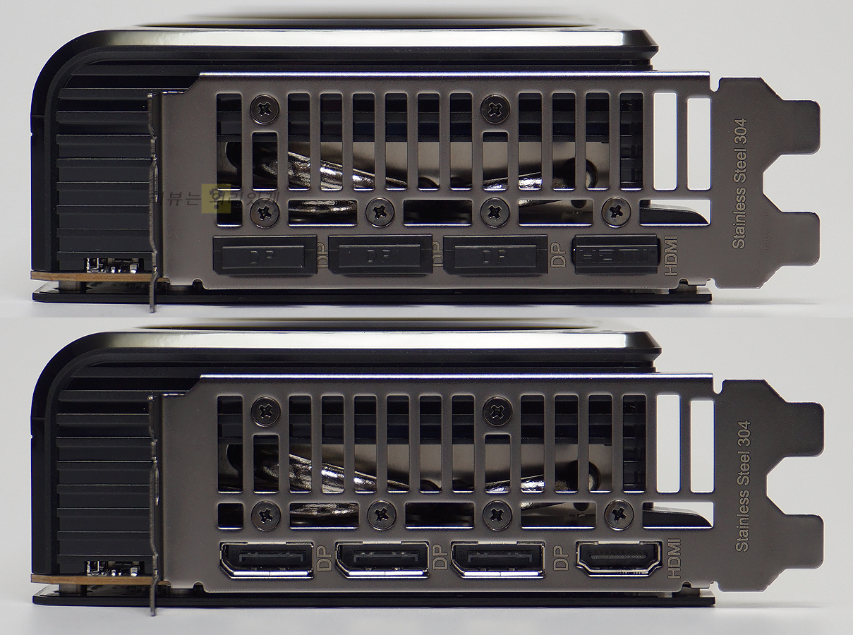 입출력 포트와 브래킷은 스테인리스 스틸 304 재질을 사용하여 부식에 강하고 물리적으로 내구성이 뛰어납니다. 포트는 디스플레이 포트 2.1 3개와 HDMI 2.1a 1개를 부착하여 총 4개의 디스플레이 연결이 가능합니다. 또한 최대 7680 x 4320 해상도(8K)까지 지원을 하고 있습니다.