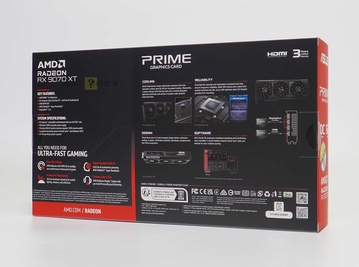 제품 개봉 방지를 위한 봉인 스티커를 부착하였으며, 그래픽카드 특징과 스펙 등의 다양한 정보를 표기하고 있습니다. 에이수스 그래픽카드 유통사는 여럿 존재하나 본 리뷰에 사용된 제품의 유통사는 대원씨티에스 입니다.