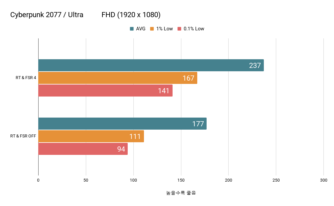 모든 게임에서 FSR 4를 활성화할 경우 평균 프레임이 대폭 상승하며 사이버펑크 2077 QHD 환경에서는 상당한 차이를 보여주고 있었습니다.
