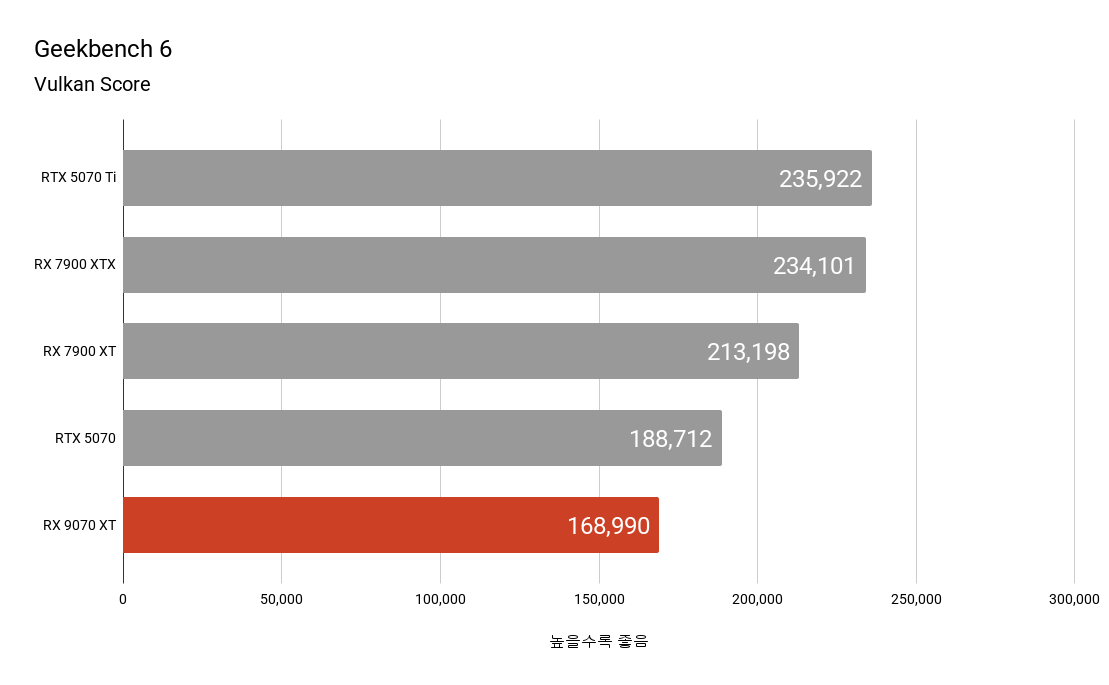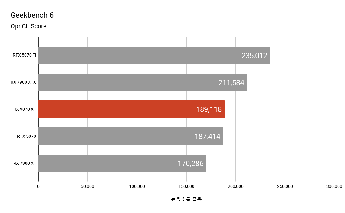 긱벤치 6의 경우 OpenCL과 Vulkan으로 구분할 수 있습니다. OpenCL의 경우 엔비디아의 강세가 뚜렷한 탓에 RTX 5070 Ti와의 점수 차이가 약 34%에 달할 정도로 큰 편이며 이전 플래그십인 RX 7900 XTX와도 큰 수준의 점수 격차를 보이고 있었으나 RTX 5070과 RX 7900 XT보다는 높은 점수를 기록하였습니다.