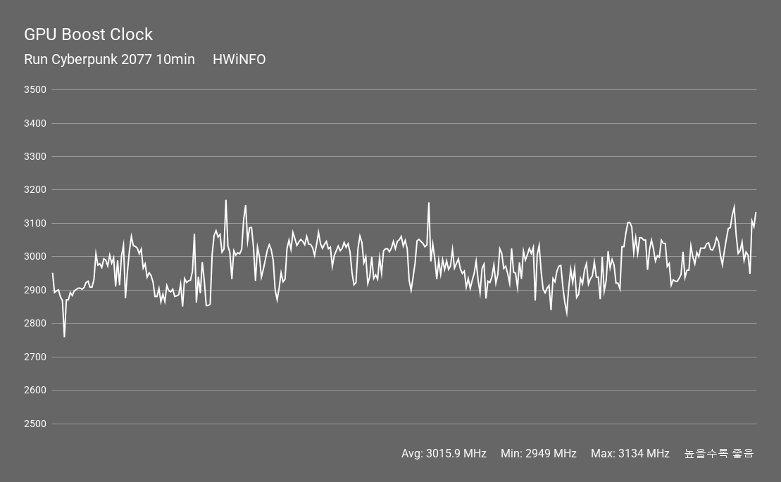 부스트 클럭은 사이버펑크 2077을 약 10분간 구동한 것을 기준으로 하였습니다. 평균 부스트 클럭은 3,015.9 MHz으로 스펙 상의 부스트 클럭인 3,010 MHz 보다 높은 클럭을 안정적으로 유지하고 있었습니다. 이를 통해 고부하 상황에서도 평균 3000 MHz 이상의 고클럭을 꾸준히 유지하고 있음을 알 수 있습니다.