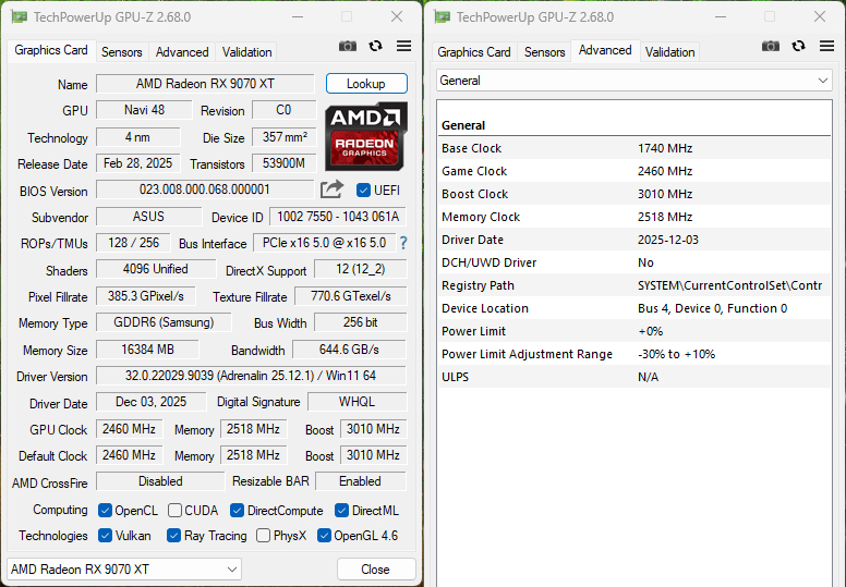▲ ASUS PRIME 라데온 RX 9070 XT OC D6 16GB GPU-Z 정보