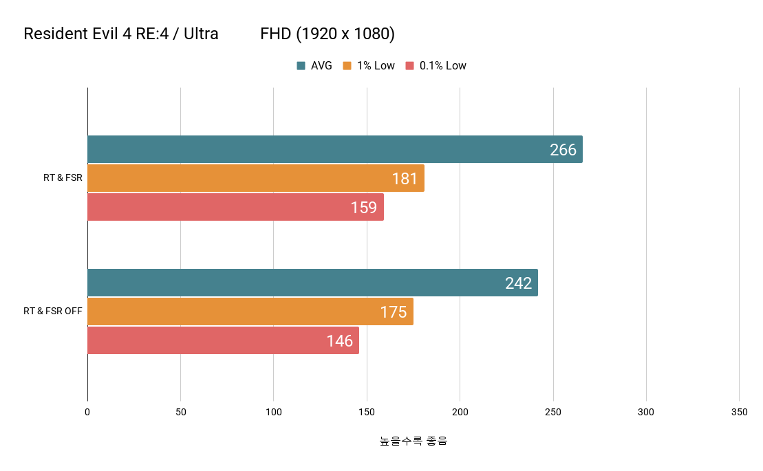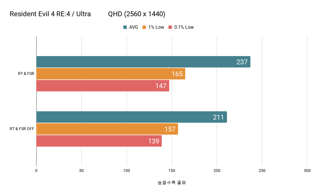 게임 테스트에서는 레이 트레이싱과 FSR을 사용한 상태와 모두 사용하지 않는 상태를 FHD와 QHD 해상도로 비교하였습니다. 여기에서 평균, 1% Low, 0.1% Low 프레임을 서로 비교하였습니다.
