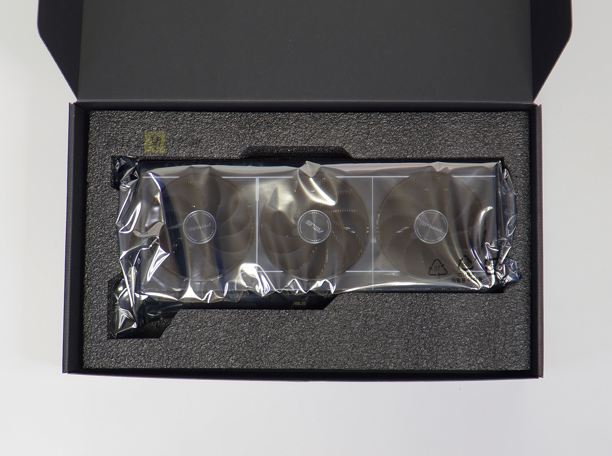 겉 박스를 개봉하면 내부의 검은색 속박스로 구성되어 있으며 가운데 금색의 에이수스 로고를 추가하였습니다. 파손 방지를 위해 내부에는 추가 포장을 하였으며 정전기 및 이물질 유입 방지를 위해 제품은 정전기 방지 비닐에 넣었습니다.