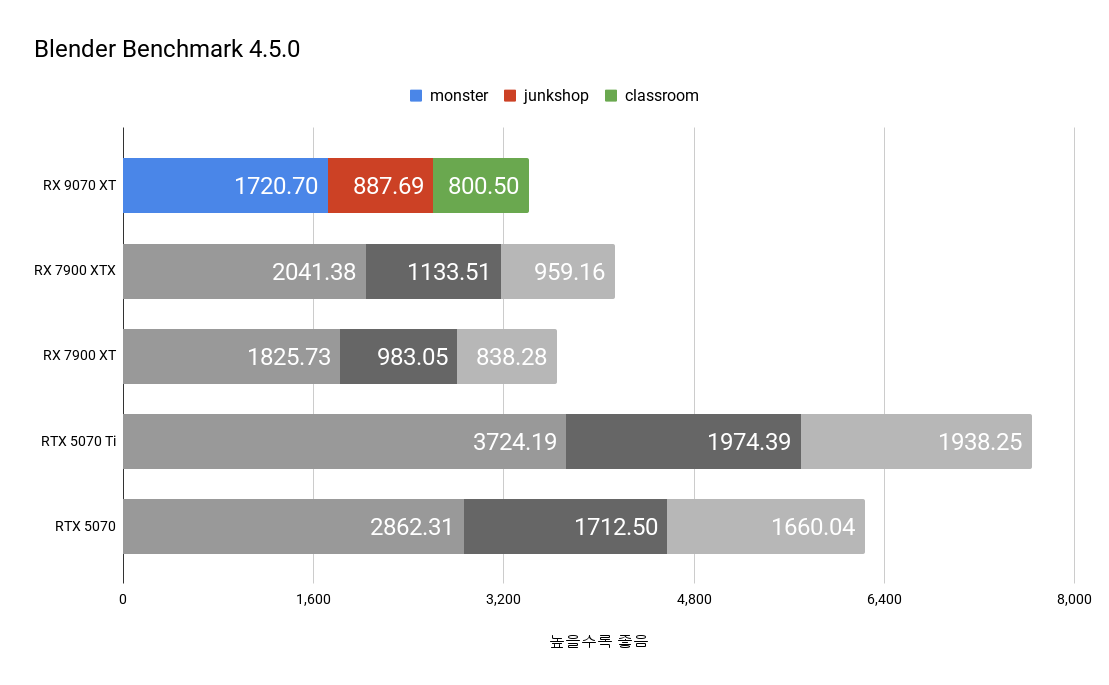 블렌더 벤치마크에서는 RTX 5070, RTX 5070 Ti가 강세를 보이고 있어 작업용으로는 엔비디아에 밀리고 있습니다. 라데온 RX 7900 XTX와 RX 7900 XT에서의 격차는 엔비디아 제품에 비해 큰 편은 아니지만 RX 7900 XTX의 벽을 넘지 못하는 모습입니다.